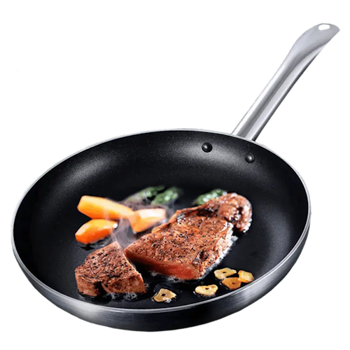 - Mehrlagiger, geschmiedeter Aluminiumkörper mit verstärkter Wandstärke, der eine gleichmäßige Hitzeverteilung ermöglicht und Hotspots auf der Kochfläche reduziert.